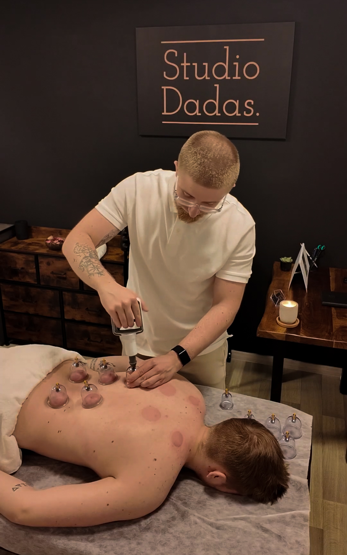 Kombinace klasické masáže a pohybu baněk po pokožce. Uvolňuje hluboko uložené svaly a podporuje detoxikaci.